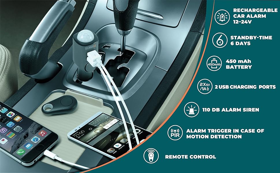 充电功能 – 2 个 USB 充电端口,每个端口输出功率为 5V/1A,允许您使用点烟器插座(如输入 DC 12–24V)同时为 2 台设备充电。此外,它还具有 2.8A 过流保护和短路保护,因此您不必担心自己受伤或损坏智能手机、平板电脑等。充电功能仅适用于点烟器汽车输入,但警报功能无需任何电线或输入即可工作